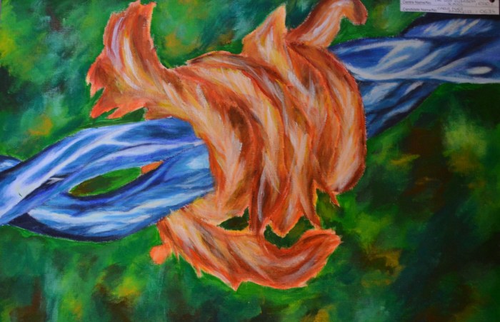 Para entrelazamiento elegí agua y fuego ya que me encanta el resultado que se obtiene al plasmar ambos elementos en la pintura, especialmente el efecto que se obtiene al combinar las paletas de colores con azules y naranjas. Para obtener una forma mezclando ambos elementos busque inspiración en la forma de los alambres de espino.
