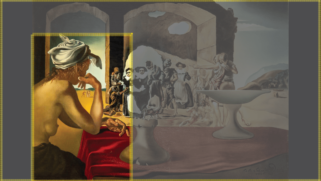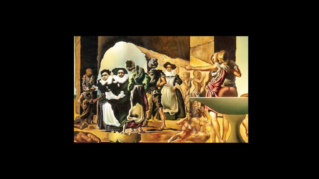 Veamos esta es una de las primeras obras que realiza Dalí tras su llegada a estados unidos, y el tema que trata es la esclavitud. Esta escena con hombres y mujeres vestidos de época, y figuras poco definidas representa una situación típica de lo que ocurría en un mercado de esclavos.