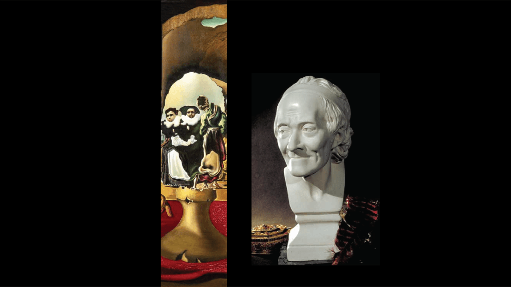 Vamos a hablar ya de esa cara que aparece cuando cambias el enfoque de tus ojos. Esta cara representa un busto del filosofo francés Voltaire. Y diréis ¿Por qué esta la cara de este señor camuflada en esta escena?