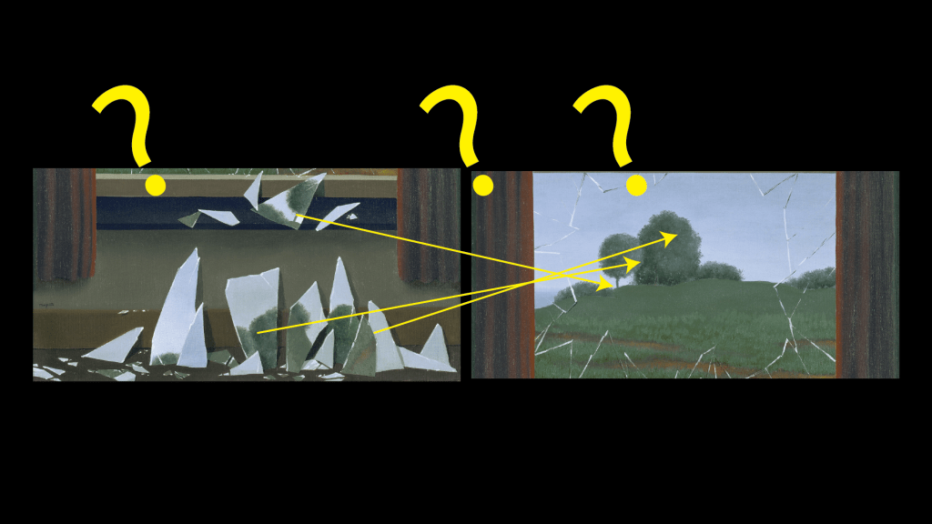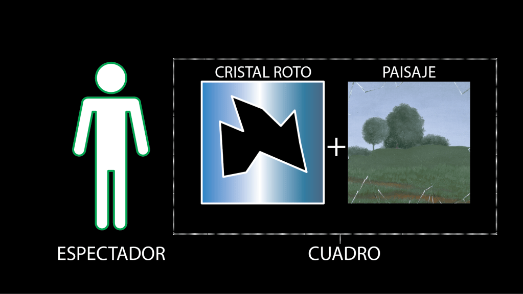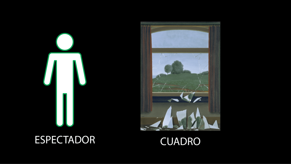 Veamos lo que esta claro es que algo ocurre. Aquí estamos nosotros como espectador. Luego Tenemos un cuadro en el que hay una ventana de vidrio, a través de la cual vemos un paisaje.