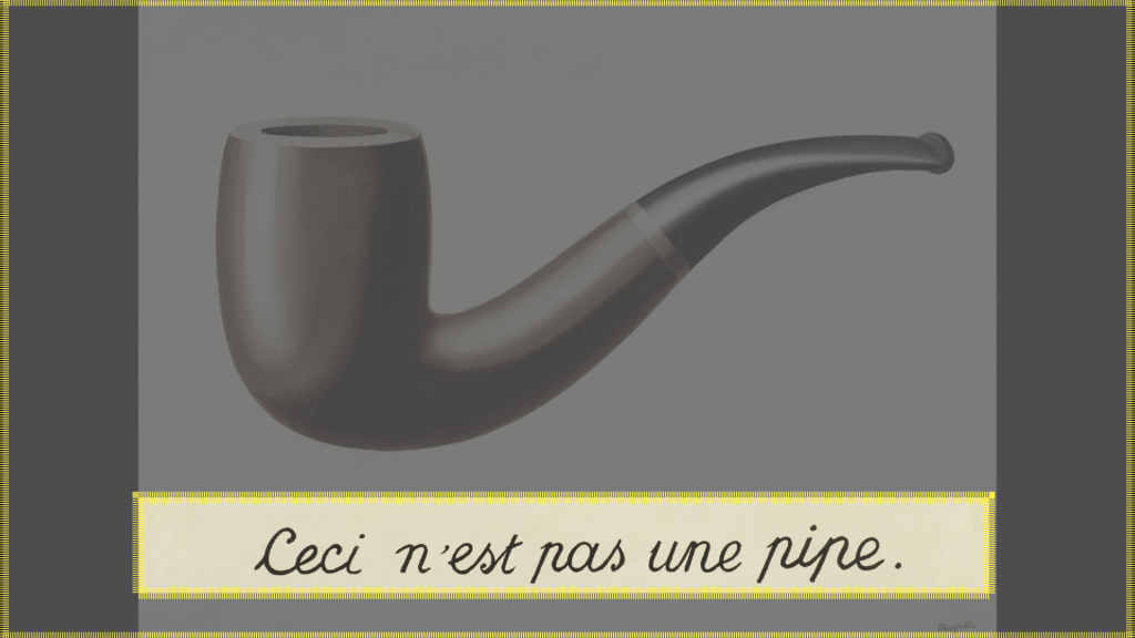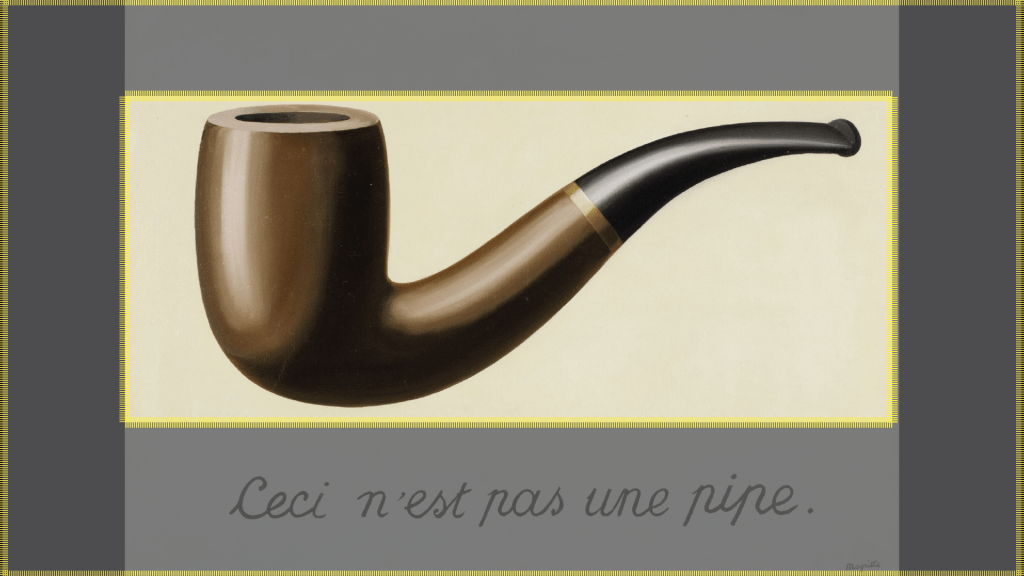Vamos a ver la composición de la obra. Tenemos una pipa y abajo en francés una frase que dice esto no es una pipa entonces tenemos el dibujo de algo que no es una pipa, aunque lo que tu RECONOCES en la imagen es UNA PIPA.