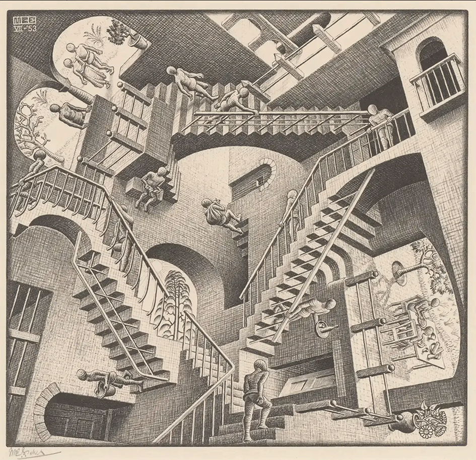La obra "Relatividad" de Escher, creada en 1953, juega con la percepción y la perspectiva, mostrando tres direcciones verticales en un único espacio. Refleja la diversidad de la sociedad y cómo diferentes grupos comparten el mismo entorno aunque sigan caminos distintos. Su mensaje destaca que todo es relativo según el contexto.